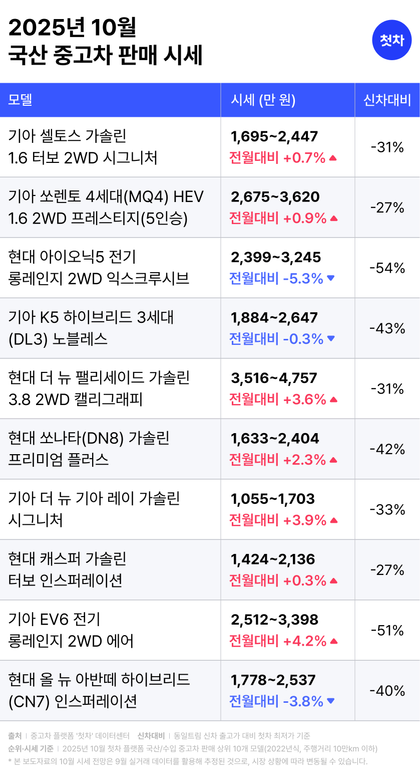 중고차 플랫폼 ‘첫차’가 2025년 10월 국산·수입 인기 중고차 모델 20종에 대한 시세 전망을 발표했다. 추석 연휴를 앞둔 10월 초의 높은 차량 이용 수요와 연휴 이후 활발해질 내차팔기 활동이 반영되며, 국산 RV와 전기차 중심의 시세 상승세와 수입 세단의 약세가 두드러질 것으로 예측된다. 이번 전망은 첫차 플랫폼의 2025년 9월 중고차 실거래 데이터 중 2022년 출고된 주행거리 10만km 이하의 매물을 대상으로 분석됐다. 국산 중고차 시장에서는 추석 연휴를 맞아 가족 단위 이동과 레저 수요가 증가하며 RV와 하이브리드 모델의 시세가 강세를 보일 전망이다. 기아 셀토스 1.6 터보 2WD 시그니처는 평균 2,079만 원으로 전월 대비 0.7% 상승하며 판매 1위를 기록할 것으로 예상된다. 기아 쏘렌토 4세대(MQ4) HEV 1.6 2WD 프레스티지(5인승) 역시 평균 3,147만 원으로 0.9% 상승, 현대 더 뉴 팰리세이드 가솔린 3.8 2WD 캘리그래피는 평균 4,137만 원으로 3.6% 상승하며 상위권을 유지할 전망이다. 반면, 현대 올 뉴 아반떼 하이브리드(CN7) 인스퍼레이션은 평균 2,168만 원으로 전월 대비 3.8% 하락하며, 연휴 전 구매 수요 감소와 세단 선호도 약화의 영향을 받을 것으로 보인다. 기아 더 뉴 기아 레이 시그니처는 평균 1,055만 원으로 3.9% 상승하며 경형차의 실용적 매력을 재확인했다.
