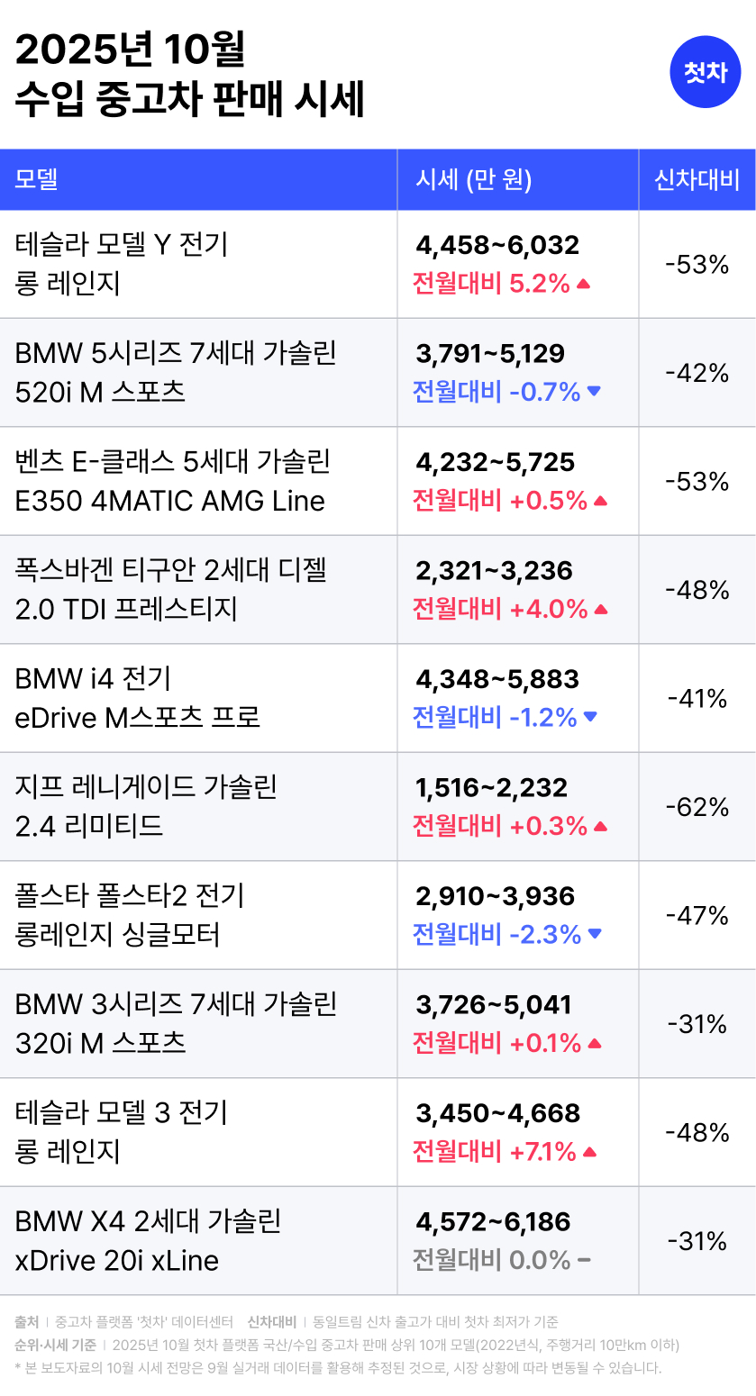 - 수입차 시장, 테슬라 모델 Y·모델 3 상승세… BMW 5시리즈·벤츠 E-클래스 하락 조짐 - 국산 RV·하이브리드 강세… 셀토스·쏘렌토·팰리세이드 시세↑, 아반떼 하이브리드