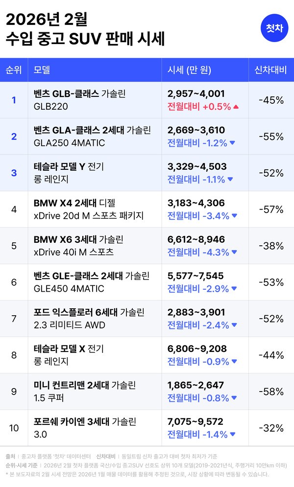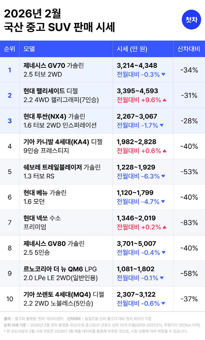모바일 중고차 플랫폼 ‘첫차’가 2026년 2월 설 연휴를 앞두고, 패밀리카의 대표 차종인 국산·수입 SUV 20종에 대한 2월 중고 시세 전망을 발표했다. 첫차 데이터센터 분석 결과, 신차 대비 시세가 절반 수준으로 형성된 5~7년 차(2019~2021년식) SUV가 노후도가 적고 상품성이 유지된 합리적 선택지로 주목받으며, 설 연휴를 앞둔 실속형 귀성객들의 관심이 집중될 전망이다. 특히 이번 분석은 장거리 주행 안정성을 고려한 대형 차종과 브랜드 가치 대비 가격 경쟁력이 극대화된 모델들이 시장의 판도를 주도하고 있는 것으로 나타났다. 국산 SUV 시장에서는 제네시스 GV70이 관심도 1위 모델로 예측됐다. GV70은 이번 달 최저 3,214만 원부터 시세가 형성되어 있으며, 이는 신차 출고가 대비 34% 감가된 수준으로 프리미엄 SUV를 찾는 소비자들에게 압도적인 가격 메리트를 제공할 것으로 보인다. 관심도 2위인 현대 팰리세이드는 최저 3,395만 원부터 만나볼 수 있으며, 신차 대비 31% 저렴한 가격대를 형성할 것으로 분석된다. 특히 팰리세이드는 1월 대비 중고 시세가 9.6% 오르며, 이번 달 국산 SUV 중 가장 높은 상승 폭을 나타낼 전망이다. 이는 설 연휴 가족 동반 이동을 위해 넉넉한 공간을 갖춘 대형 SUV를 찾는 소비자들의 관심이 시세 상승에 영향을 미친 것으로 풀이된다. 반면, 쉐보레 트레일블레이저는 1월 대비 6.3% 하락하며 국산 SUV 중 가장 큰 하락 폭을 기록해 실속형 구매자들에게 우수한 매수 타이밍을 제공할 것으로 보인다. 현대 넥쏘는 신차 출고가 대비 83%에 중고 시세가 형성되어, 인기 모델 중 가장 큰 감가 폭을 기록할 전망이다.