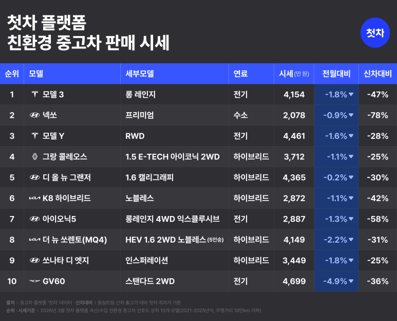 - 이란 전쟁 발 유가 급등에 '연료 효율' 최우선하는 경제적 소비 성향 뚜렷 - 중고 친환경차 중 구매검토 1위는 ‘테슬라 모델 3’, 최저가 모델은 ‘넥쏘 프리미엄’ 1천만원대 중반부터
