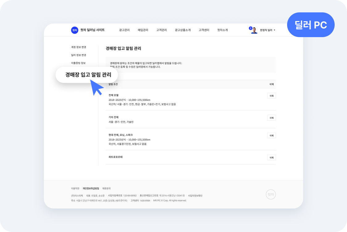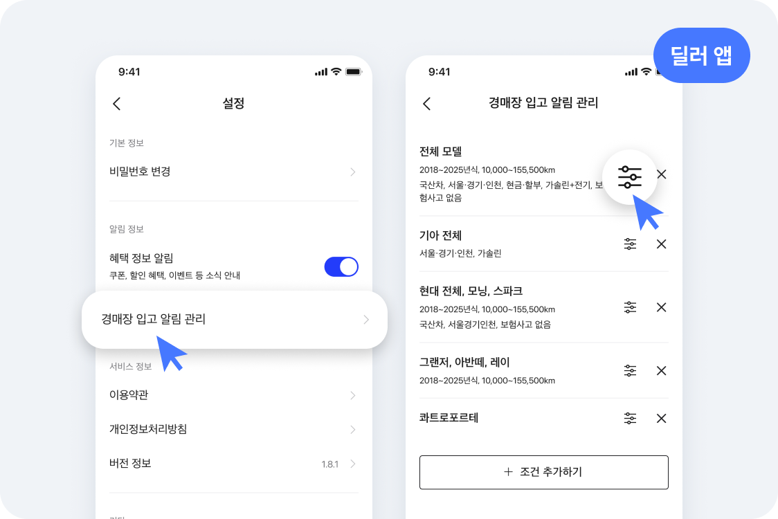 3. 설정된 조건은 '딜러앱 설정 > 경매장 입고 알림 관리'에서 수정·삭제하실 수 있습니다. ※ PC(딜러 사이트)에서는 조회·삭제만 가능합니다.​