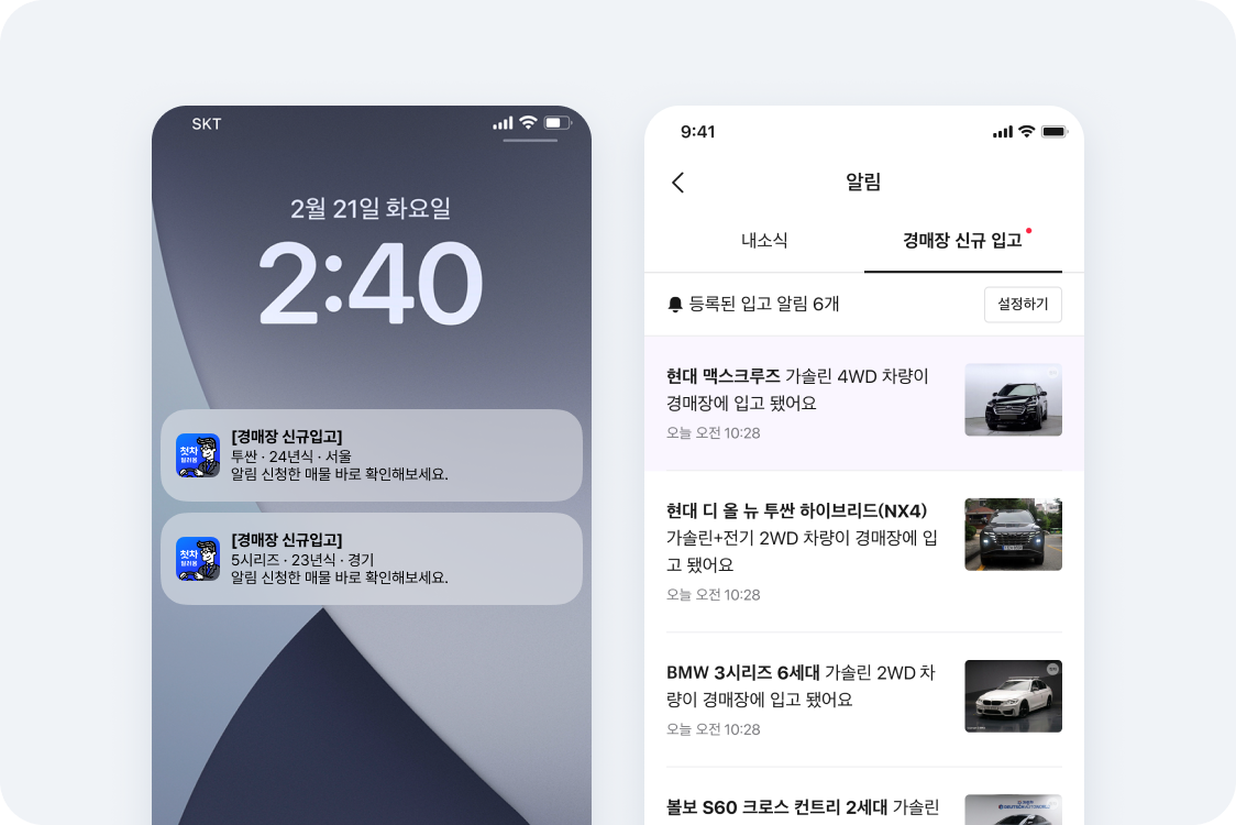 설정한 조건에 맞는 차량이 경매장에 출품되면 앱 푸시/알림으로 빠르게 확인하고 입찰할 수 있어요.
